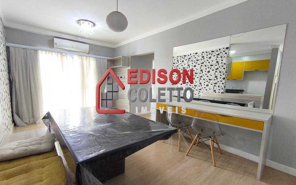 Sala 2 Ambientes com ar condicionado, painel sob medida para TV e a mesa com cadeiras, que permanecerão no imóvel, reforçam a proposta de praticidade aliada ao estilo.
