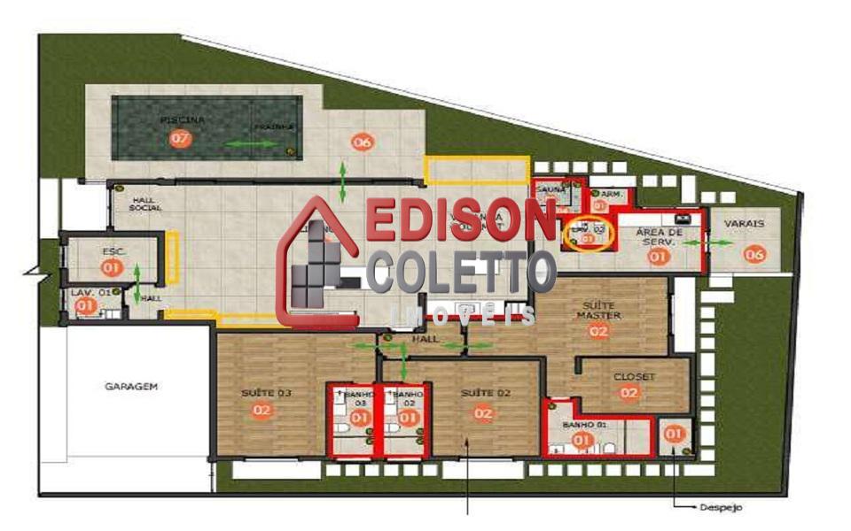 Detalhes : Irrigação automática no jardim, Pontos de torneiras e chuveiros com água quente/fria e pressurizados, Ar-condicionado tipo Split nas suítes e no escritório, tipo cassete na cozinha/sala de jantar e gourmet, Som ambiente: 4 caixas embutidas no teto da sala/cozinha + 2 caixas embutidas no teto gourmet, 2 pontos na área externa da piscina, Sistema de automação (iluminação, interruptores e persianas).
