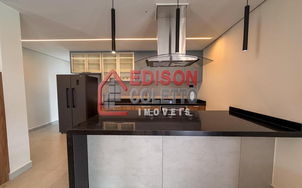 Cozinha integrada Gourmet com peninsula em granito preto, equipada com Geladeira Side by Side (2 portas), Lava-louças e utensílios completos.